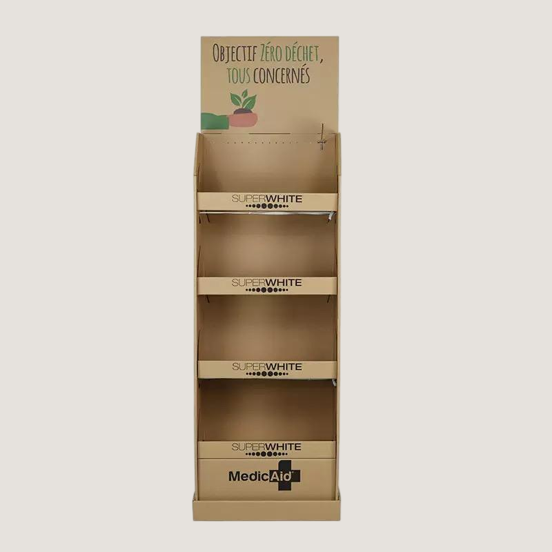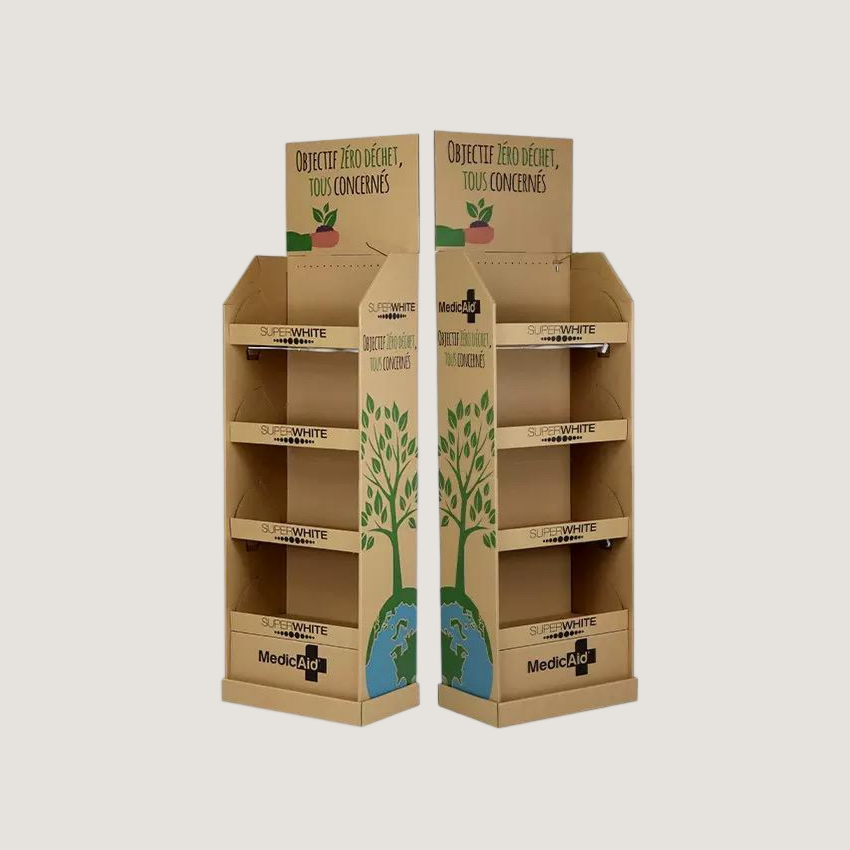 Constructed from high-quality corrugated cardboard, kraft paperboard, or lightweight yet sturdy materials, the stands feature multi-tier shelving or tiered trays to hold multiple beverage sizes securely. Integrated dividers prevent bottles or cans from tipping, while open-front or angled displays maximize product visibility and encourage impulse purchases.