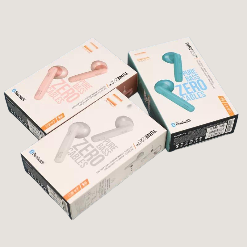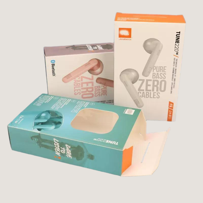 Optional inserts, including EVA foam, molded pulp, or cardboard trays, hold the earphones and accessories securely, preventing damage during transit. Fully customizable with full-color printing, embossing, foil stamping, spot UV, or matte/gloss lamination, this packaging enhances brand presentation while providing a professional unboxing experience. Eco-friendly and recyclable materials are available for sustainable packaging solutions.